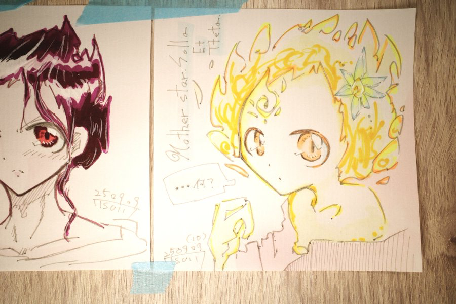 同光源下でのカラー差分。 カラー変更点は記載済み。 褪色した結果、他のペンと近い色の出るものは使い切るまで使おうかなとも。 それにしても右目の発色だいぶ変わるな…印象も変わるよね。 イラストを並べてのカラー差分。 以下、カラー変更点。 髪留め:FYG1(褪色)・FY1(褪色)→Y11・Y18 左眼:W2→W00(今後、どちらも使用) 右眼:FY1(褪色)→FY 右眼ハイライト:YG06(褪色)→YG06 服:RV69→RV19![]()