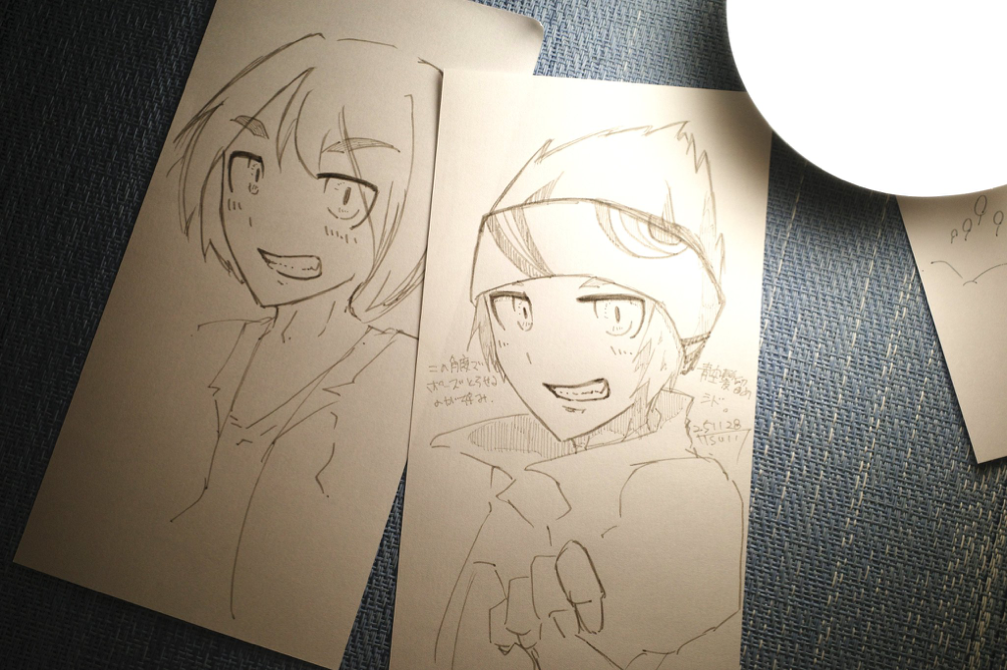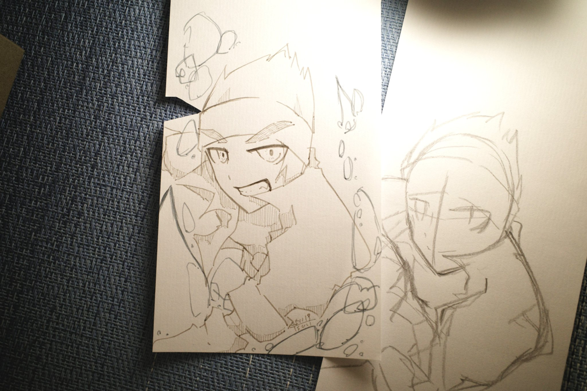 先週の楽描き見直したら顔の向きおんなじ角度してんのな((((((( まだシドの顔描くの苦手なんだな…あともーすこし明るくにかっとさせたい。 また描きます。 普通に優しげな「にかっ」になってしまったので没絵。 本当はキリッとさせたかっやつです。 2028/11/30 23:51 にかっと笑う※没絵![]()