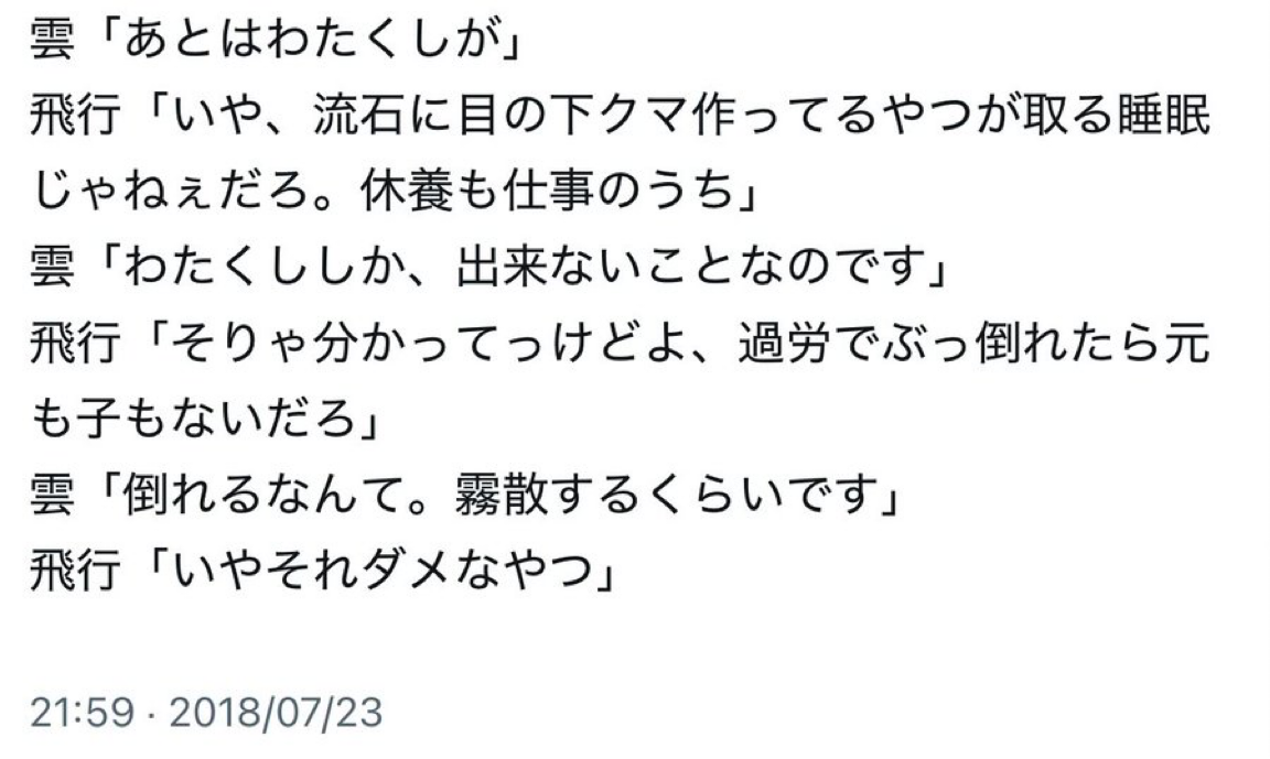 本日の…というわけではないですが、当時のキャラツイ抜粋。 雲が現イヴ、飛行が現シドです。 シドがイヴの超過労作業を(結局出来なかったけど)手伝ったときのキャラツイひとコマ。 一刻しか寝なかったイヴを嗜めようとしたシドがこの後怒るやつ(((((( 懐かしいなぁ… 最初、いくら飛行でも雲の仕事量止められねーだろってぶち当てたら飛行の方が一枚上手で、ぶっちゃけ僕が一番嬉しかった話です。 だからリアタイ即興創作やめられんのよ…何起こるか僕も予測できなくて結果的に楽しいので。