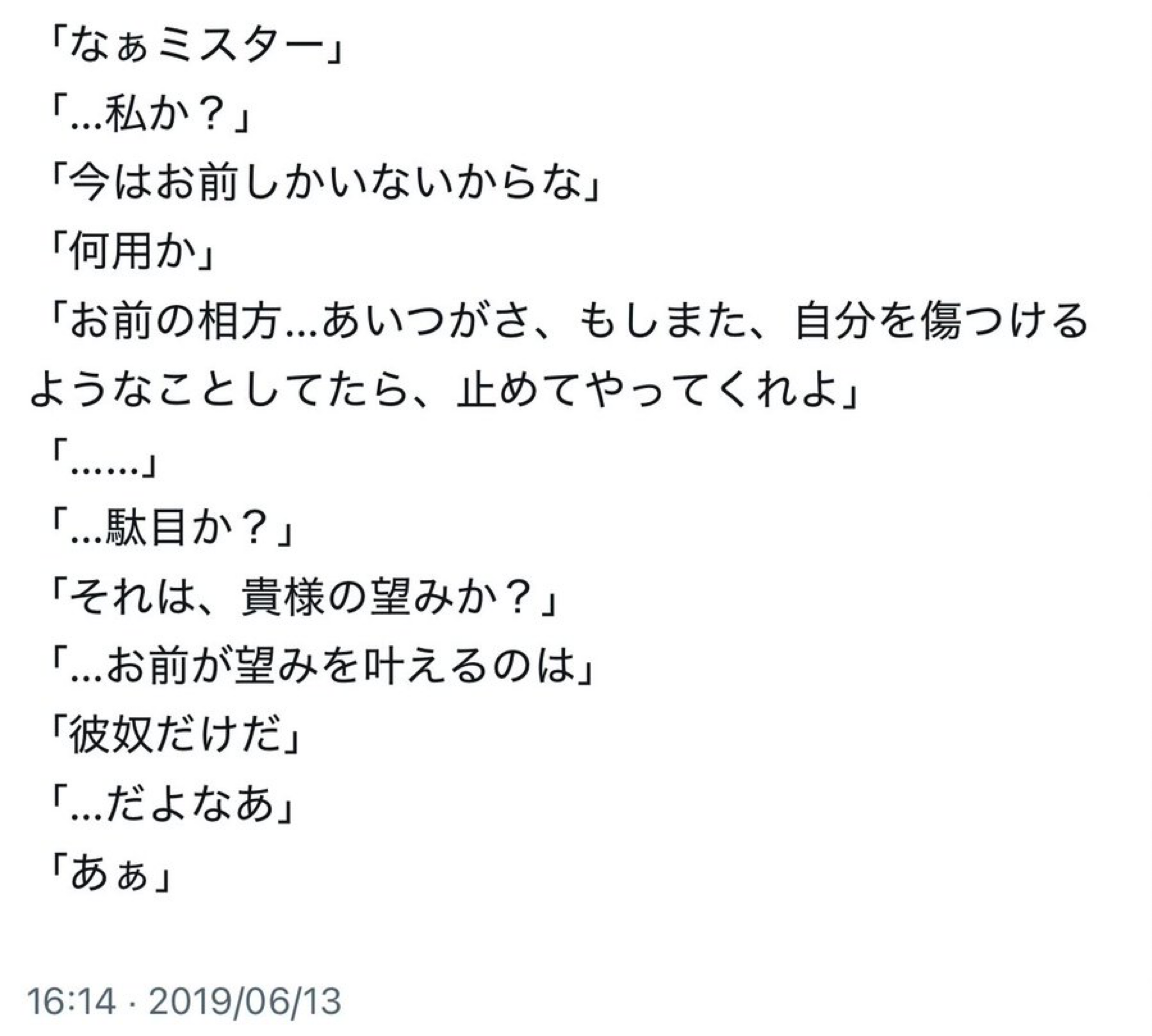 あと、サルベージしてると消したくないツイート(主にキャラツイ)が多くて消すのに労力。 なのでそこにも時間かけて消してます。 昔の自分にありがとうだよ責任もって手元に残すからな…! 8/1→8/12分までのサルベージ分これから消してきます。 シドが活躍してるとこのキャラツイ消したくないなー…(ぱたり 割とダメージくるよねツイ消し。 シドがイヴの泣きむし弄りするのは、〈大極夜〉以降に旧母星が目覚めなくなったことでかなり気を病んで涙雨降らすようになったイヴを元気付けるための冷やかしなんだよね。 それでお前の気が紛れるなら、いくらでも言ってやんよってね。 そんなネタ元をこれから消す(サルベージ済み)