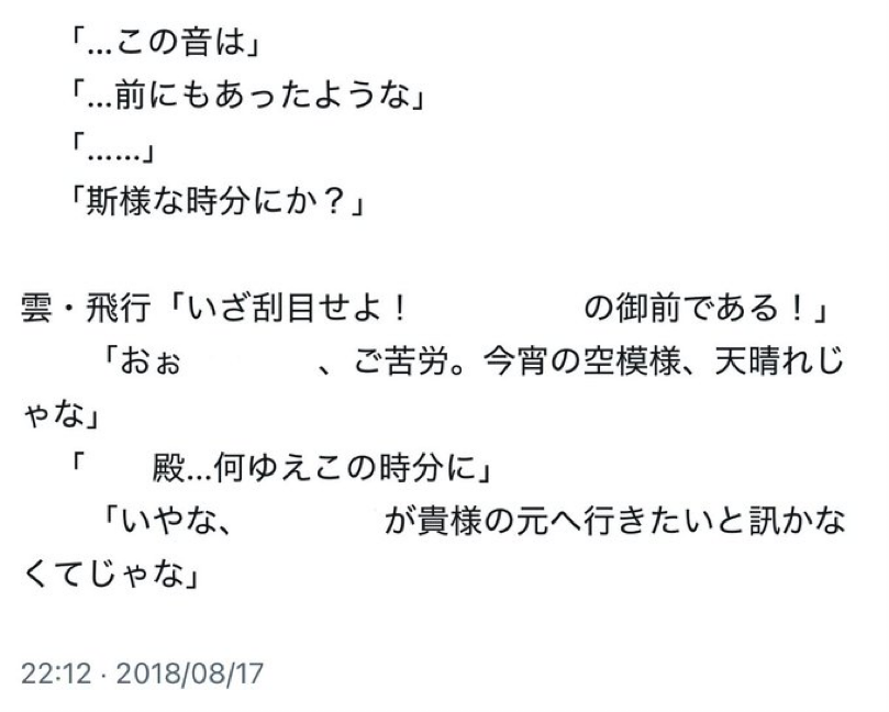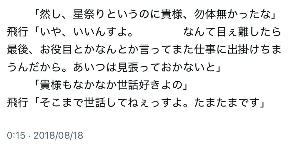 あと、当時の伝統的七夕が8/17で、その日に当時の小説執筆をひとつ書き締めてるんですよね。 だから、キャラツイート時系列が小説完了と〈星祭り〉が合わさってちょっと変わった〈星祭り〉ツイートにできたのが今でも感慨深く。 それをこれから消すのか…なんだか寂しい(でも消します