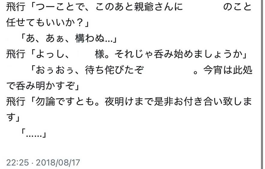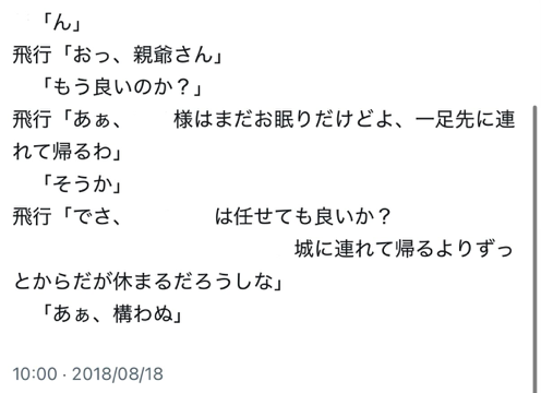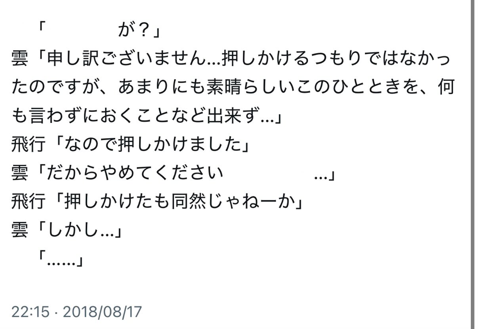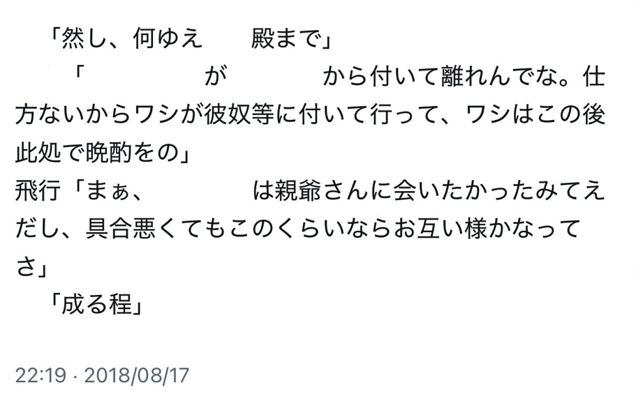 〈星祭り〉での先代月の所業が素敵すぎてひと言(一時間くらい)言いたいのに疲労困憊で動けない雲(現イヴ)が国長様と飛行(現シド)と共に(半ば引き摺られつつ)先代月の元へ押しかける話。国長様がいるのはこの後飛行と共に〈星祭り〉の呑み会始めるためです((((( 一部文章消してますあしからず。![]()