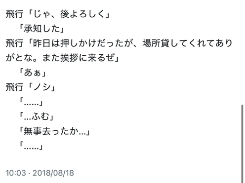 カディンは『プラネッタ』なんで、朔君とはいつか会えるかもしれないけど飛行士兄さんとは絶対交わらない世界線だよ今のところね。 飛行士兄さんは『プラネッタ』にならないからね。 僕の考えるクロスオーバーって、ちょっと前に論文の出た世界が二つあってお互いやりとりしてる云々のあれに近い。自分の言いたいこと論文にされた気分だった。だから、あの意味はよくわかるんですよ是非とも推したい。